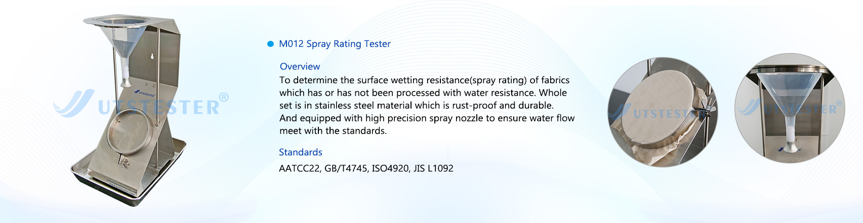 Test Procedure: Under specified conditions and procedures, water is sprayed onto a stretched specimen to form a wet streak on the surface. The size of the wet streak correlates to the fabric's water repellency. The evaluation result is determined by comparing this wet streak with a standard wet streak.
