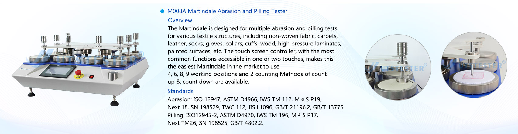 The Martindale Abrasion Test is a test of textile products using the Martindale standard system to determine the abrasion resistance of a fabric. Abrasion resistance refers to a fabric's resistance to repeated friction with other materials. Pilling resistance is a key quality indicator of textile products, directly impacting their durability and performance. The Martindale Abrasion Tester is used to test a fabric's abrasion and pilling resistance.